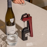 Start by placing the system on top of your bottle. In one smooth motion, press down firmly in one smooth motion, this allows the precision-engineered needle to pass through the cork. Tilt the bottle as if you were pouring from an open one. Then, quickly press and release the trigger to inject pure argon gas into the bottle. Wine flows when the trigger is released.